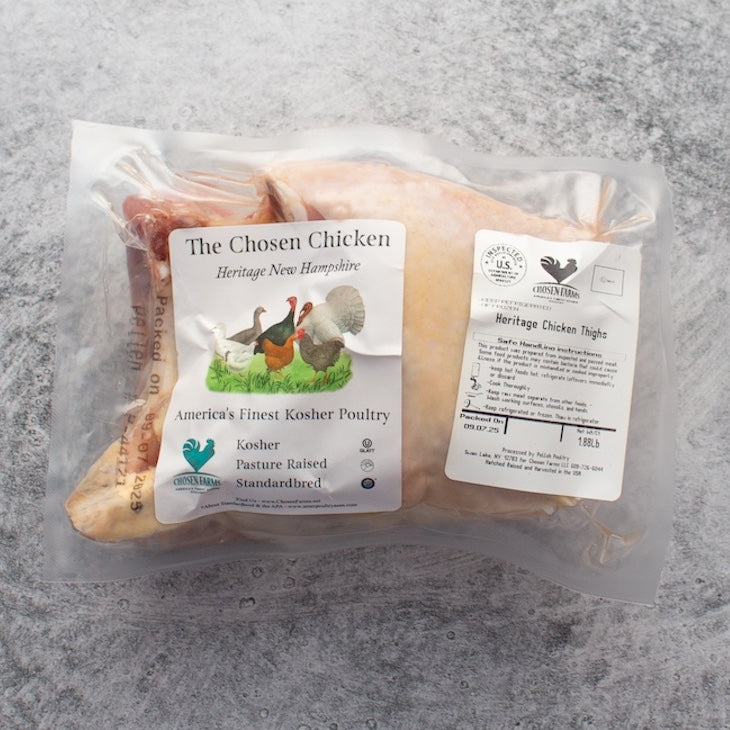 Our heritage chicken thighs are the perfect way to elevate your favorite chicken dish. Meaty, juicy and bursting with flavor, this dark meat melts in your mouth. The vivid yellow fat and well-colored dark meat can be attributed to their age, activity, and careful breeding.