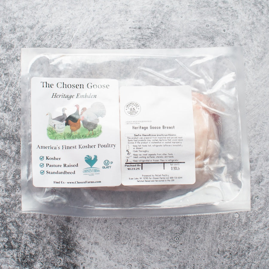 Beneath the skin lies a generous layer of heritage goose fat that slowly renders as it cooks, basting the meat from the outside in. This subcutaneous fat keeps the breast exceptionally moist and infuses it with a silky, mouth-coating richness. The result is an extraordinary eating experience—crisp skin, juicy meat, and a flavor that’s at once refined, primal, and unforgettable.