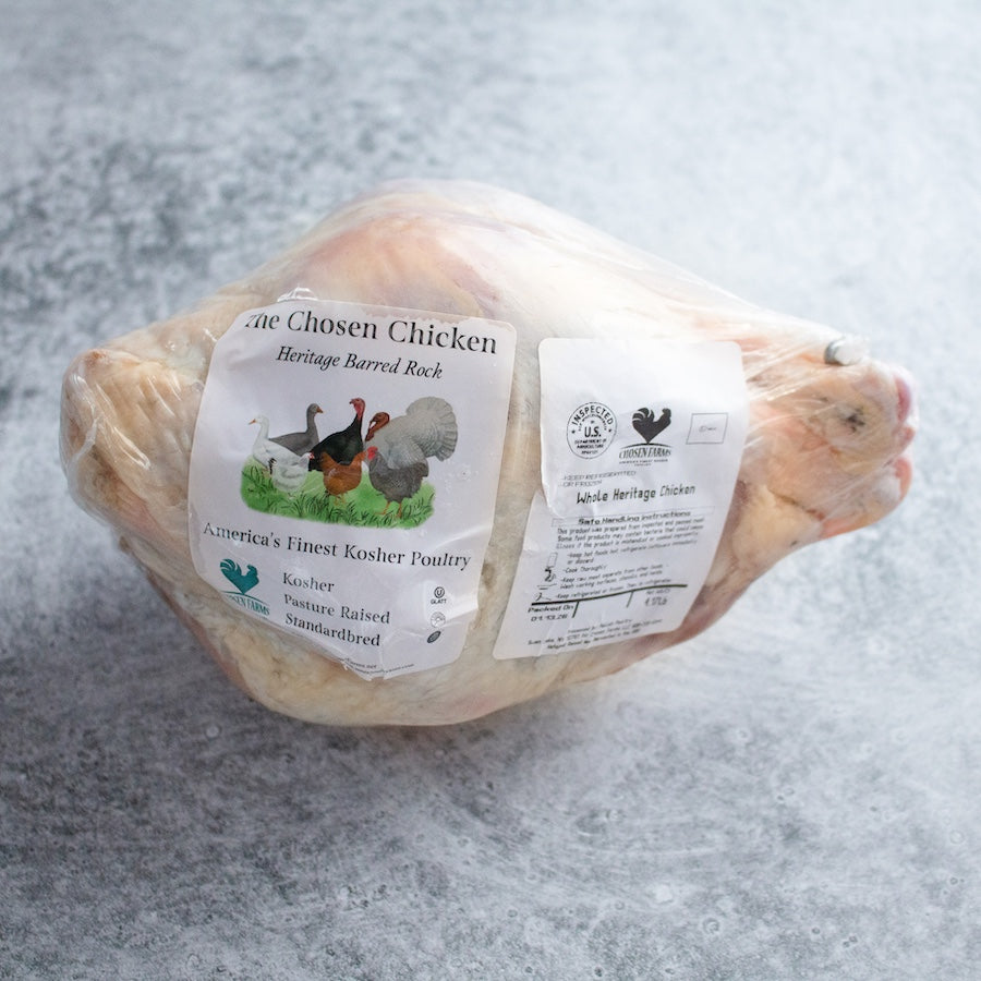 The Barred Rock was America’s most popular meat chicken for over 70 years—and for good reason. This striking black and white striped bird, with its supple yellow skin, is exceptionally vigorous and produces meat with deep, old-fashioned chicken flavor that modern commercial birds simply don’t deliver. It is our slowest-growing bird, and that leisurely growth translates directly into flavor: fuller, more developed, and deeply satisfying. Now, for the first time in decades, kosher consumers can once again enjoy a true Standardbred Barred Plymouth Rock.